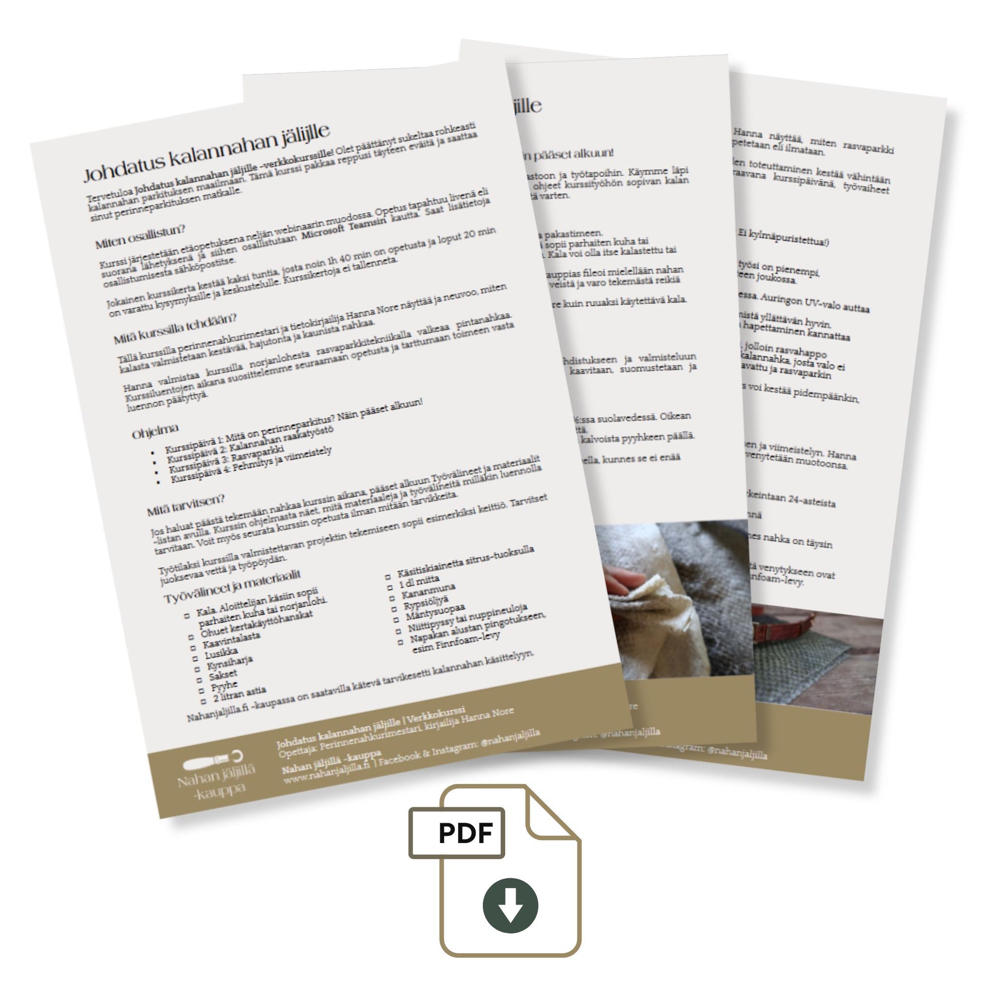 Neljän etäopetuskerran aikana Hanna näyttää ja neuvoo, miten kalasta valmistetaan kestävää, hajutonta ja kaunista nahkaa perinnemenetelmin. Saat kattavan johdatuksen perinneparkituksen peruskäsitteisiin, työvälineisiin ja työtapoihin. Kurssi soveltuu hyvin aloittelijalle ja kurssityön voi toteuttaa helposti vaikka omassa keittiössä.